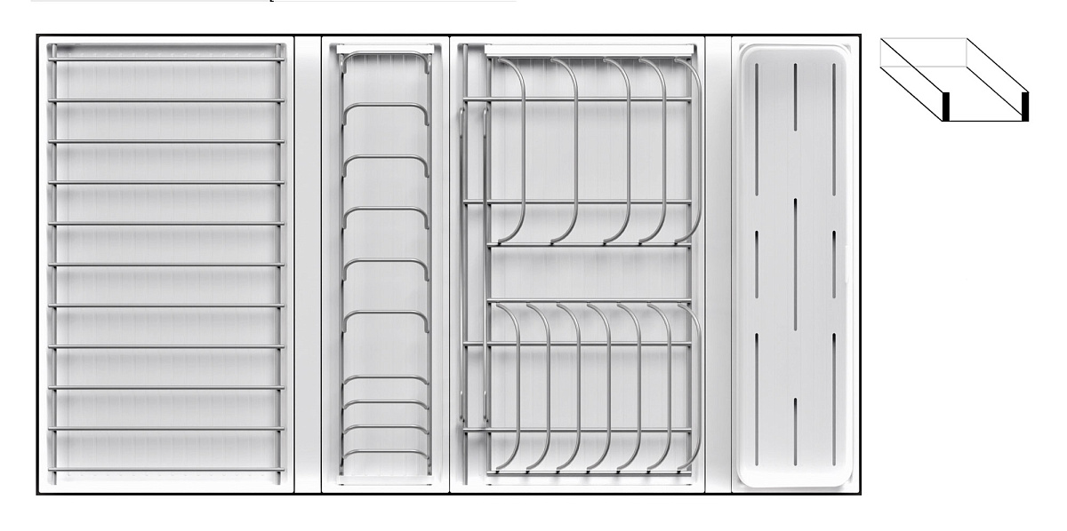 1 для столовых приборов (состоит из: 1 х емкость пластиковая 400 х 100 х 120 мм, 1 х поддон пластиковый 423 х 124 мм)