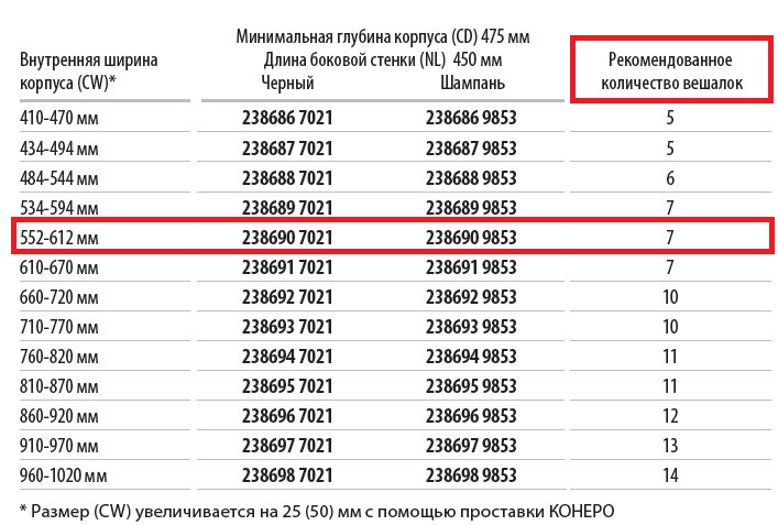 Размер (CW) увеличивается на 25 (50) мм с помощью проставки КОНЕРО