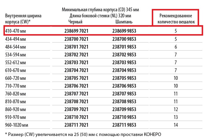 Размер (CW) увеличивается на 25 (50) мм с помощью проставки КОНЕРО