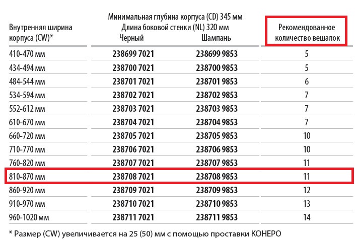 Размер (CW) увеличивается на 25 (50) мм с помощью проставки КОНЕРО