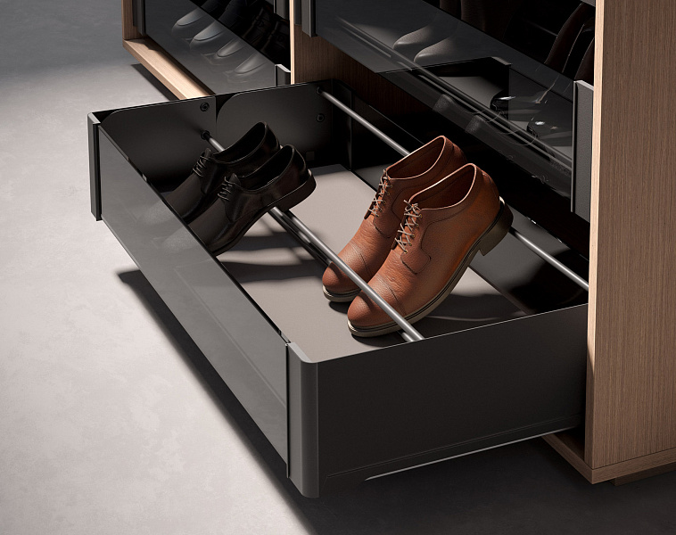 Поскольку профиль подставки для обуви можно устанавливать на двух уровнях, система хранения подходит для обуви любого размера, начиная с 35.