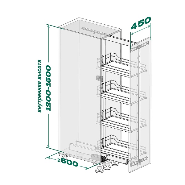 • Высокая нагрузка на механизм в 100 кг (по 18 кг на полку) позволяет организовать хранение большому количеству предметов, при этом даже при полной загрузке система выдвигается легко.