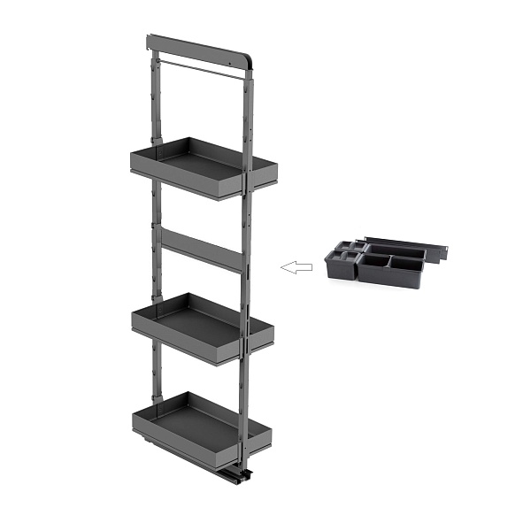 • Высокая нагрузка на механизм в 100 кг (по 18 кг на полку) позволяет организовать хранение большому количеству предметов, при этом даже при полной загрузке система выдвигается легко.