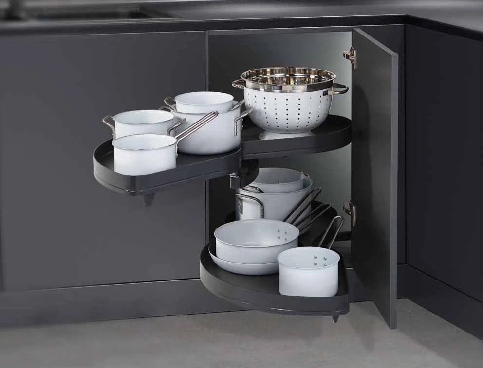 Коллекция Арена Пьюр с цельнометаллическими бортиками – актуальное решение для внутреннего наполнения современных кухонь. Тонкие линии и стильный внешний вид полок в сочетании с цветом антрацит позволяют сделать внутренний дизайн кухни эстетичным добавлением к внешнему.
